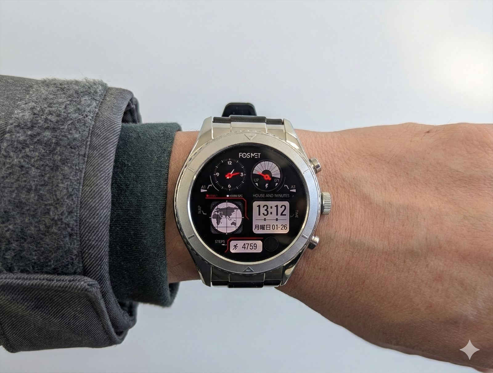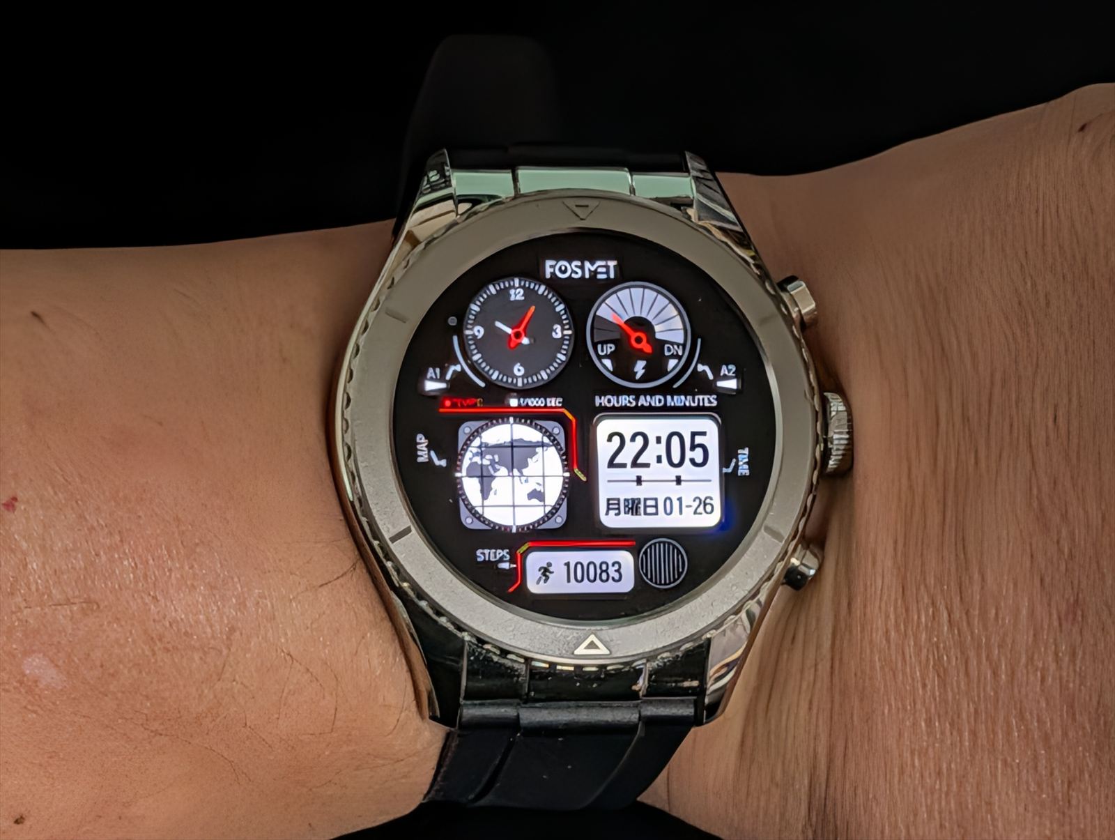 FOSMET R1は、腕時計感のあるデザインと大きな画面がお気に入りです。これまで使っていたスマートウォッチは画面が角形でした。確かに広く使えますが、個人的には丸形のディスプレイの方が味わいがあって好きです。元々のアナログ時計の形だからなんですかね? 時計と丸い形は相性がいいように思います。